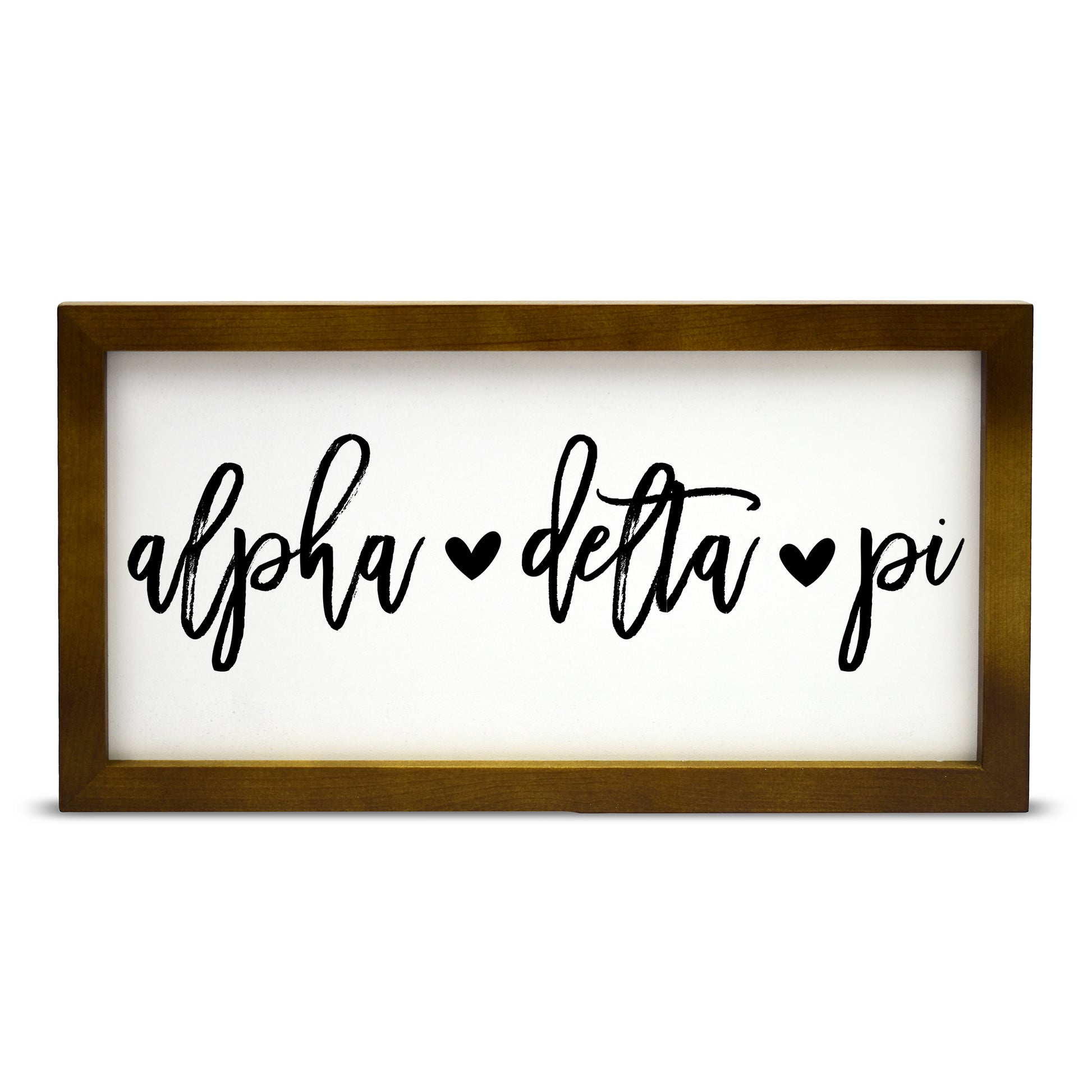 Add Sorority Spirit to your décor with our Sorority Script Large Wall Art! Each wooden sign features a brushstroke script with heart detailing on canvas and bordered with a wooden frame. A great item for yourself or to give as a gift, our wooden sign makes the perfect statement piece for your dorm or sorority house!