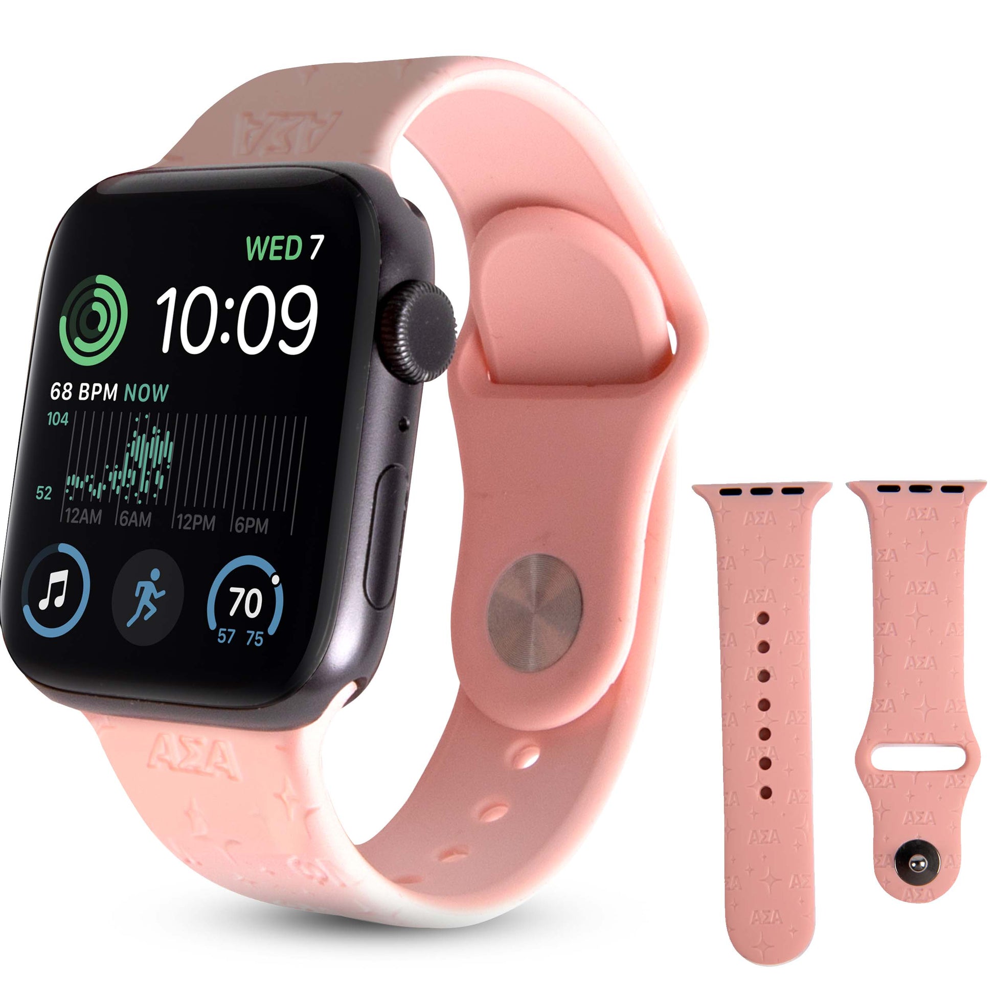 Represent Alpha Sigma Alpha sorority in style with our brand new Silicone Smart Watch Band! Each band is embossed with your sorority's letters and trendy repeating star pattern. Fully adjustable to your wrist size and easily cleaned due to the durable silicone, our watch band is the perfect accessory to wear year round. The best part? Our bands are the cutest shade of Millennial Pink!