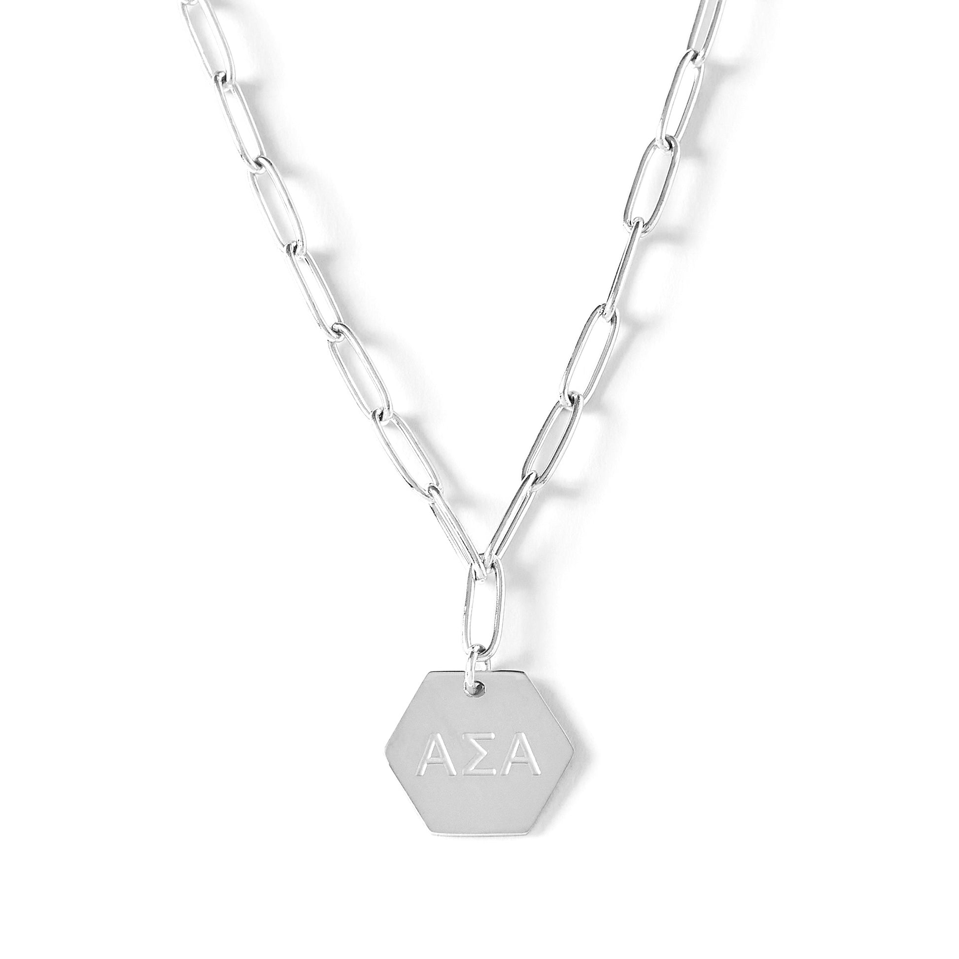 The perfect gift of Sisterhood! Our Alpha Sigma Alpha Necklace features your sorority's Greek letters on a 15mm hexagon shaped pendant, with a paperclip style chain, all dipped in silver! Perfect for a bid day gift, big little gift or a treat for yourself!