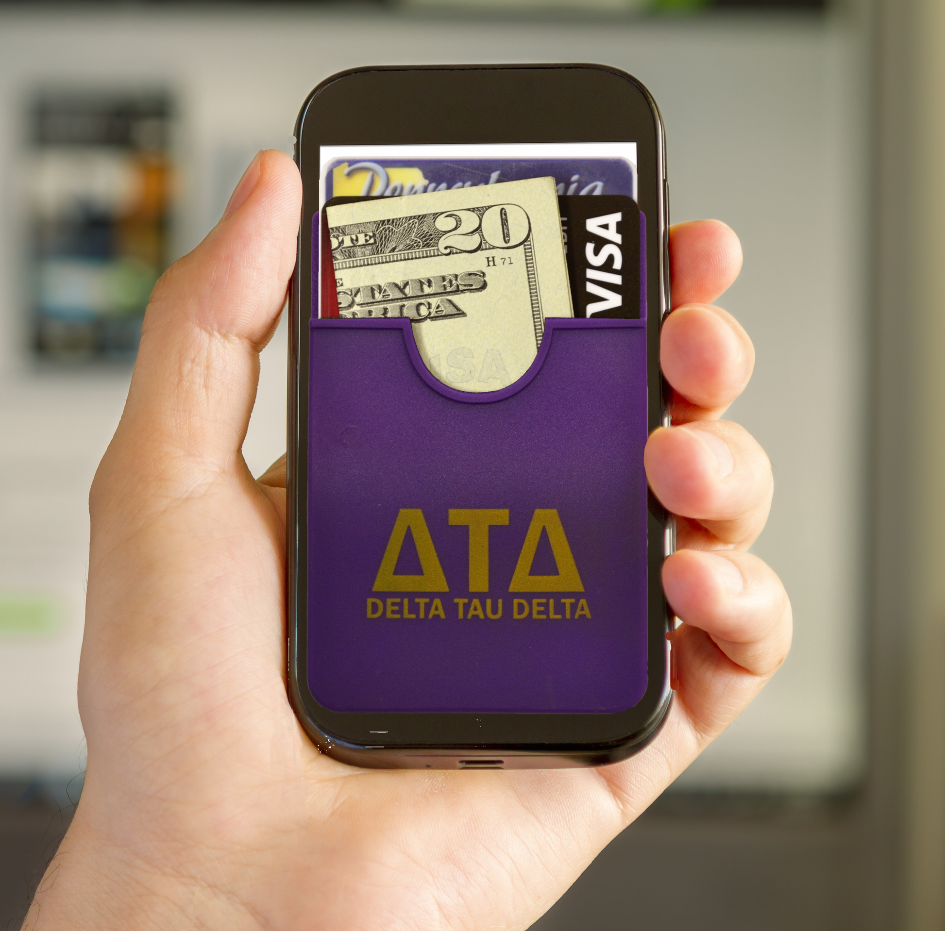Show your fraternity pride with the Koala Pouch, adhesive cell phone wallet, the perfect solution for the multitasker on the go! Keep all of your valuables safe and secure in one place while reducing the amount of items you routinely carry. The Koala Pouch will securely hold up to 3 cards at a time and helps you with gripping your device as well.