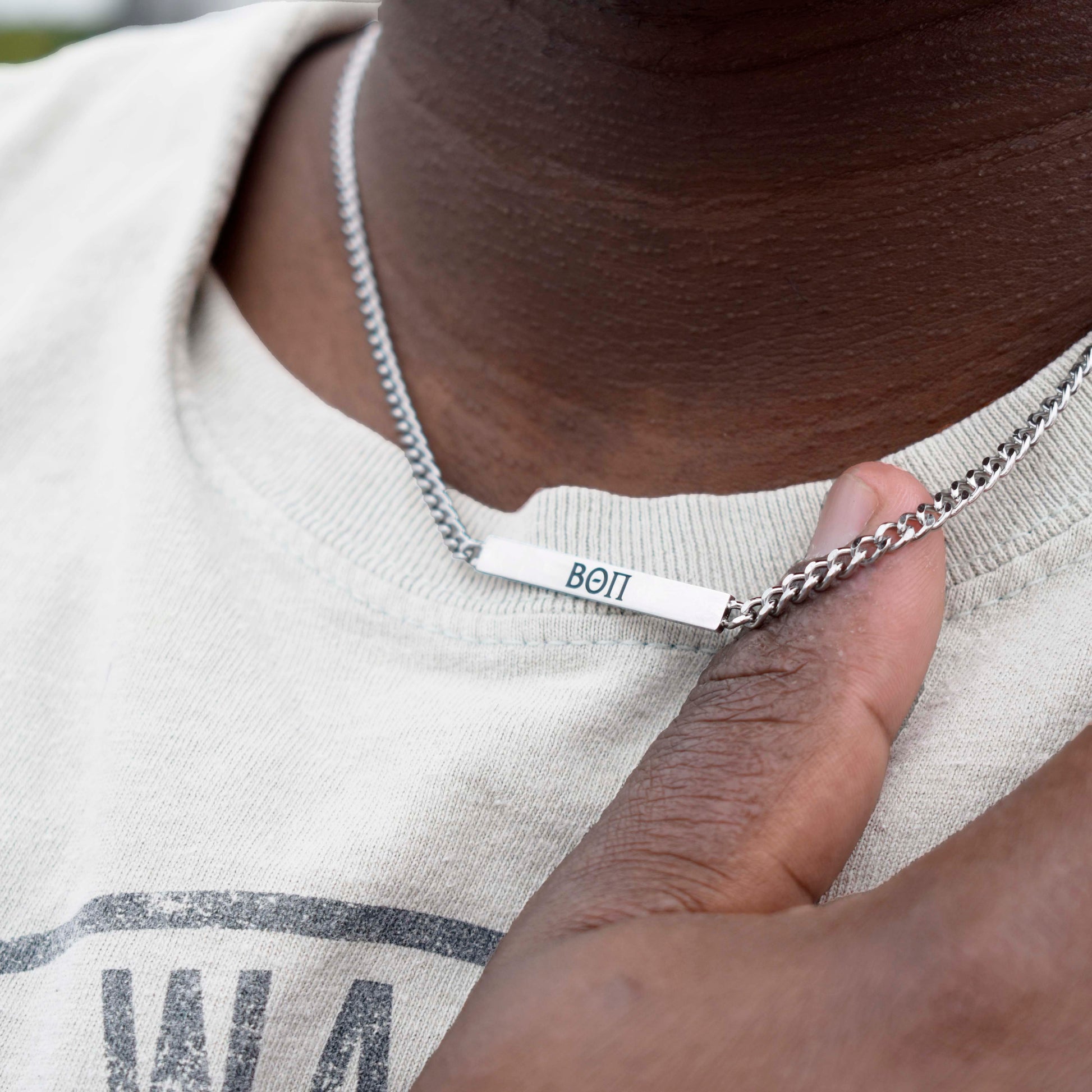 STAINLESS STEEL QUALITY CONSTRUCTION – The stainless steel chain necklace is 18" (with a 2" extension) and securely attaches to the 1 ½” x 3/16” steel bar pendant featuring the engraved fraternity letters. Results in an eye-catching look!
