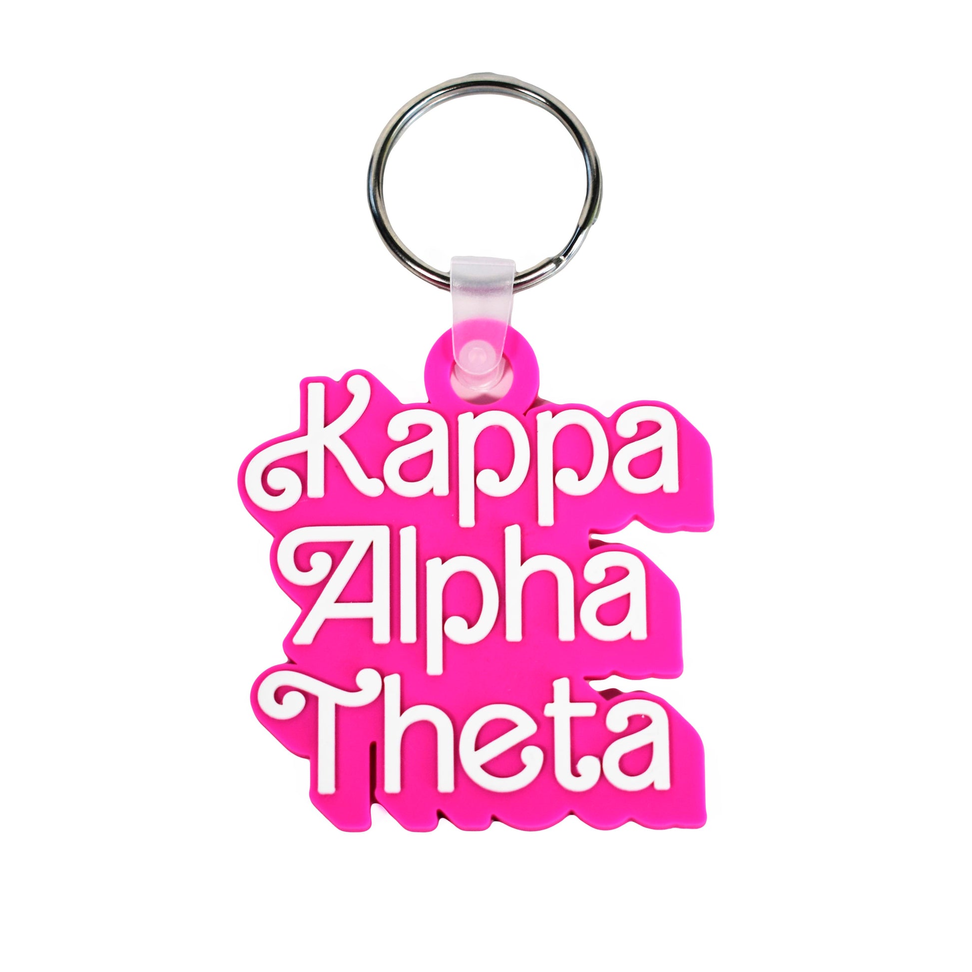 Carry your Kappa Alpha Theta pride with you wherever you go! Crafted with soft silicone in bright pink and white, our Officially Licensed Retro Dolly Sorority Name Keychains feature your sorority name in raised lettering with that gorgeous font.