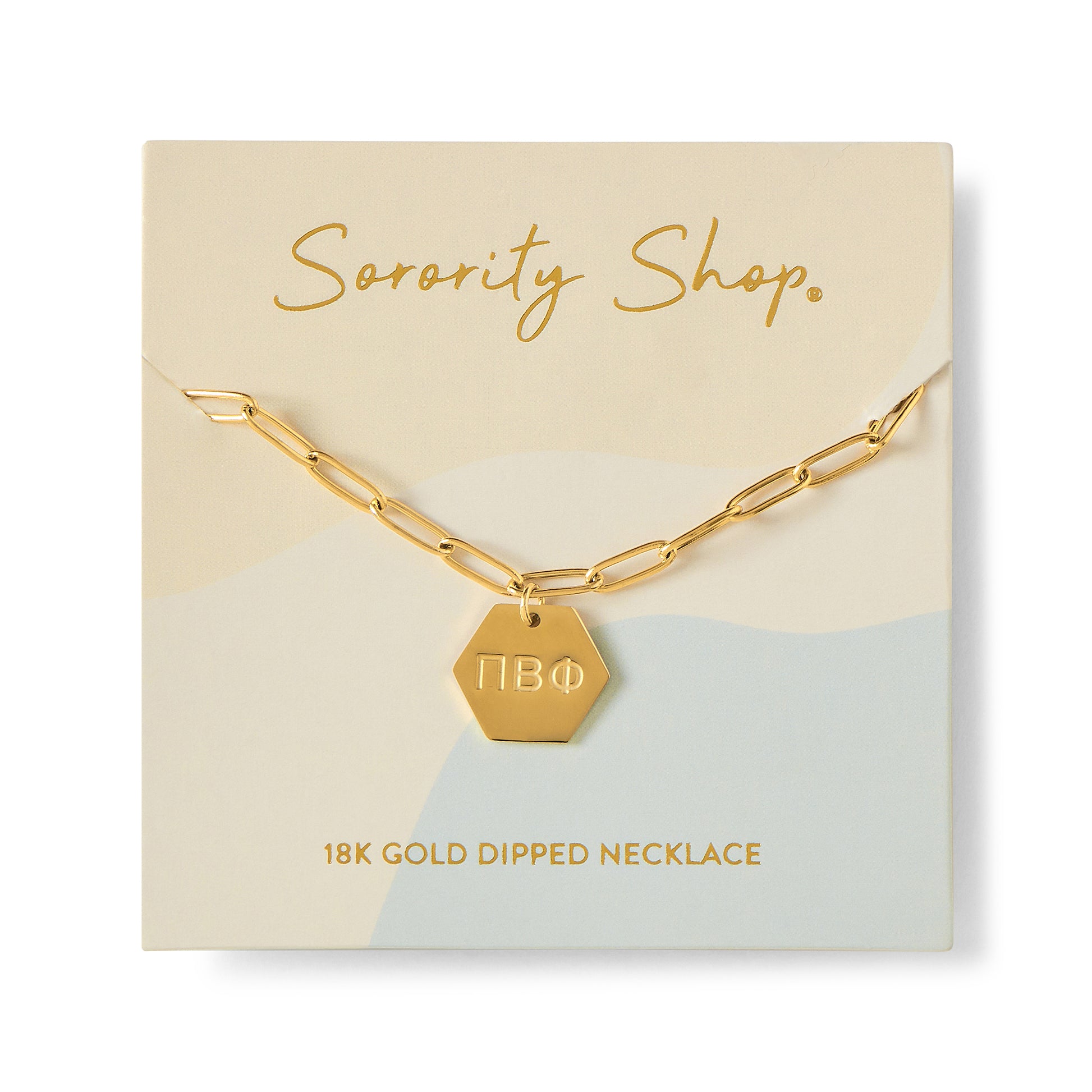 The perfect gift of Sisterhood! Our Paperclip Style Chain Sorority Necklace features your sorority's Greek letters on a 15mm hexagon shaped pendant, with a paperclip style chain, all dipped in 18K Champagne gold! Perfect for a bid day gift, big little gift or a treat for yourself!