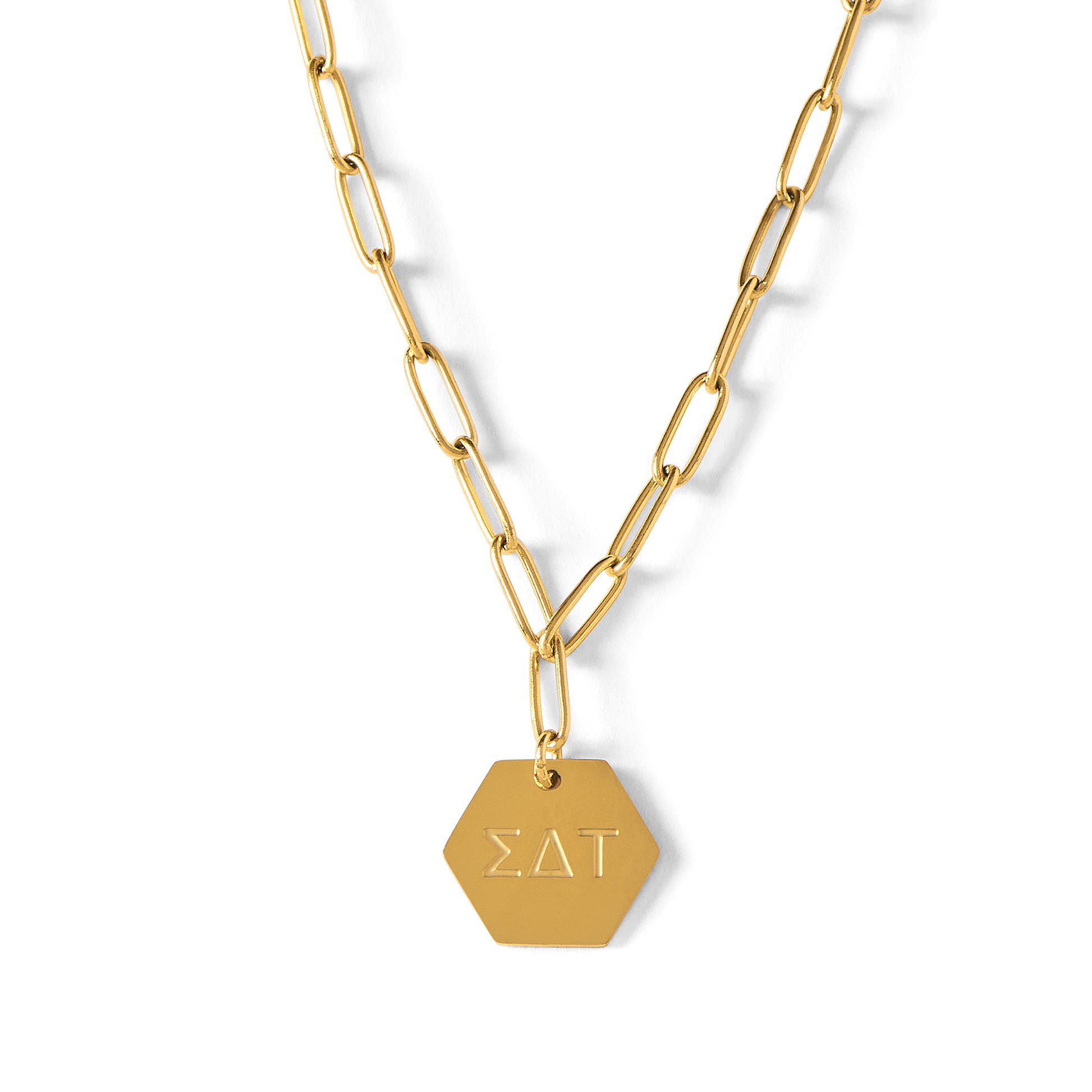 The perfect gift of Sisterhood! Our Paperclip Style Chain Sorority Necklace features your sorority's Greek letters on a 15mm hexagon shaped pendant, with a paperclip style chain, all dipped in 18K Champagne gold! Perfect for a bid day gift, big little gift or a treat for yourself!
