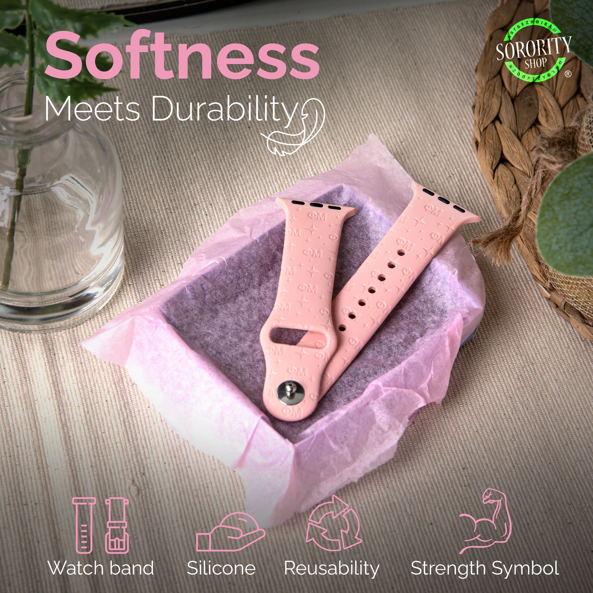 Represent Sigma Kappa sorority in style with our brand new Silicone Smart Watch Band! Each band is embossed with your sorority's letters and trendy repeating star pattern. Fully adjustable to your wrist size and easily cleaned due to the durable silicone, our watch band is the perfect accessory to wear year round. The best part? Our bands are the cutest shade of Millennial Pink!