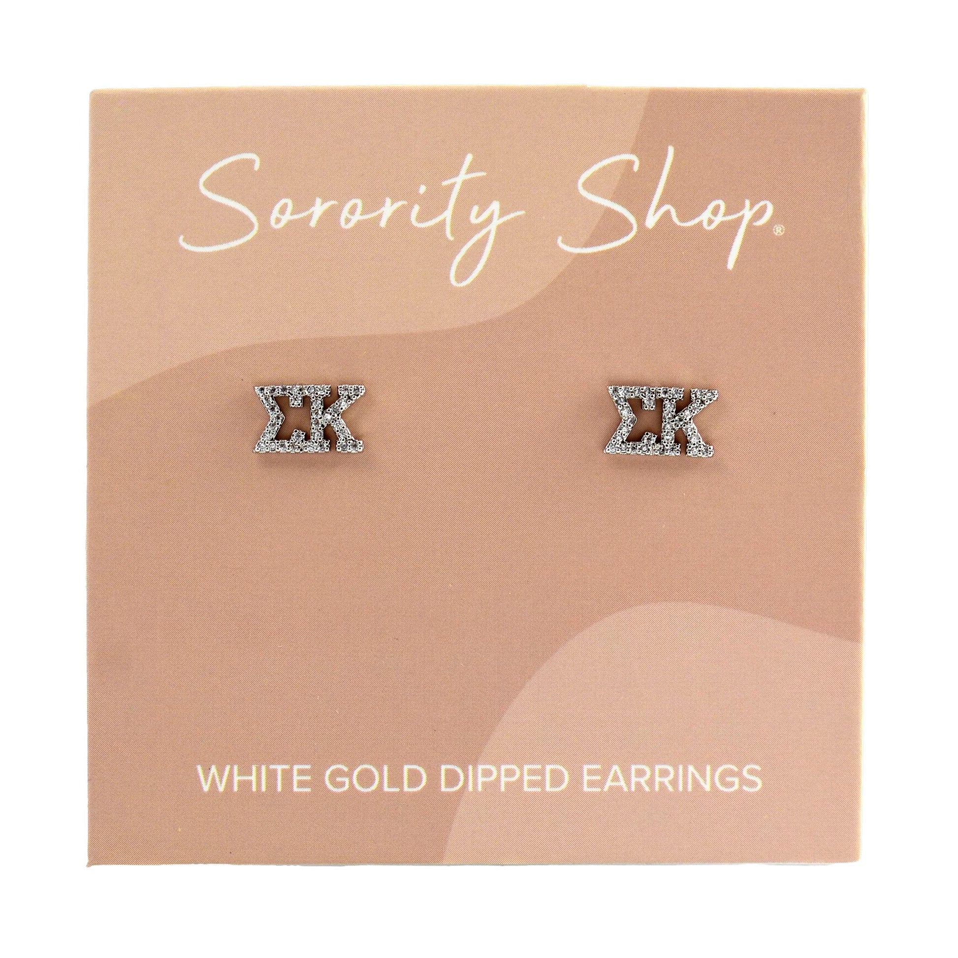 - STUD EARRING DESIGN – Our white gold-dipped Sigma Kappa earrings are designed to make a statement. The Cubic Zirconia (CZ) studded sorority Greek letter earrings provide a unique look.