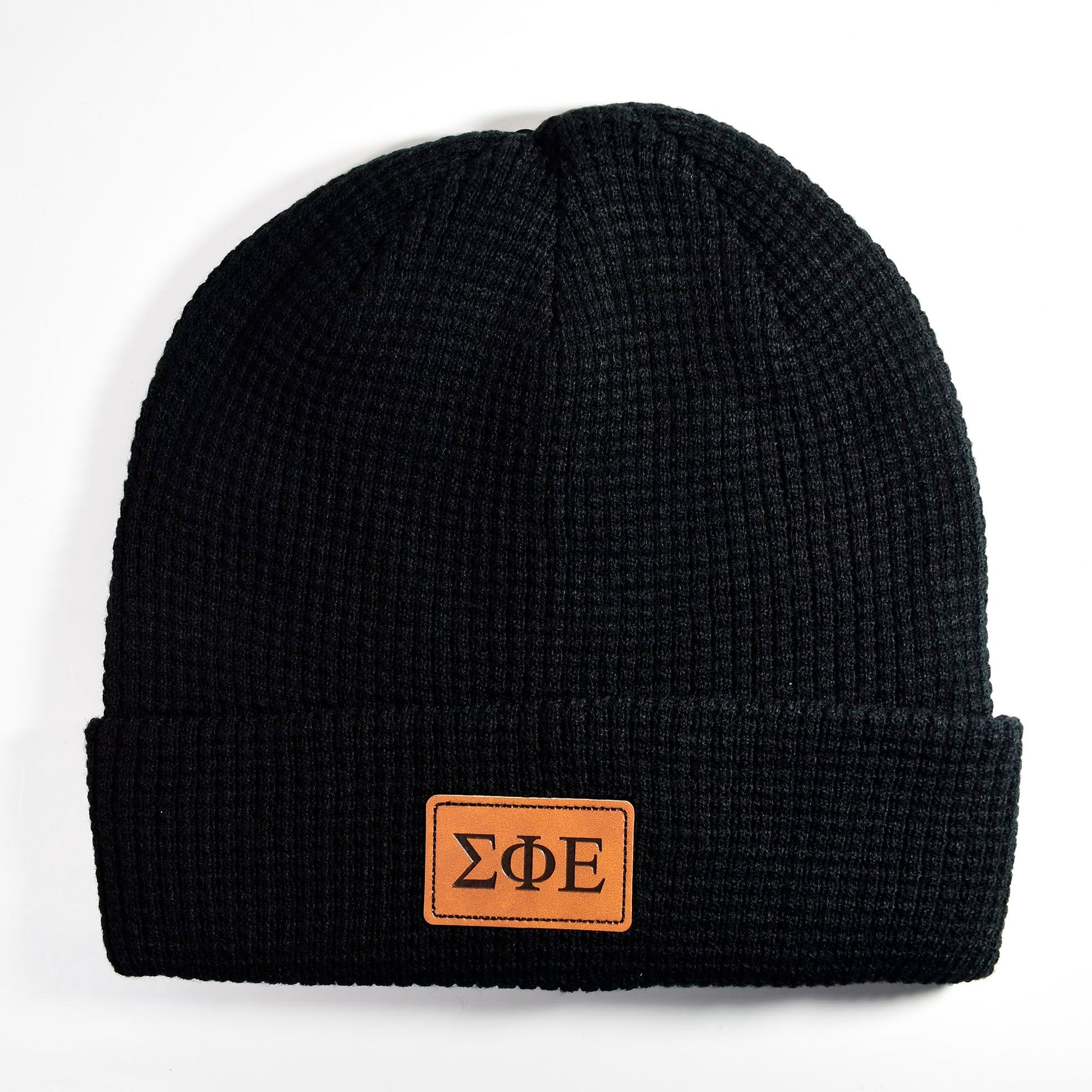 Sigma Phi Epsilon Fraternity Beanie Hat - Black Winter Hat w/ Greek Letters Patch