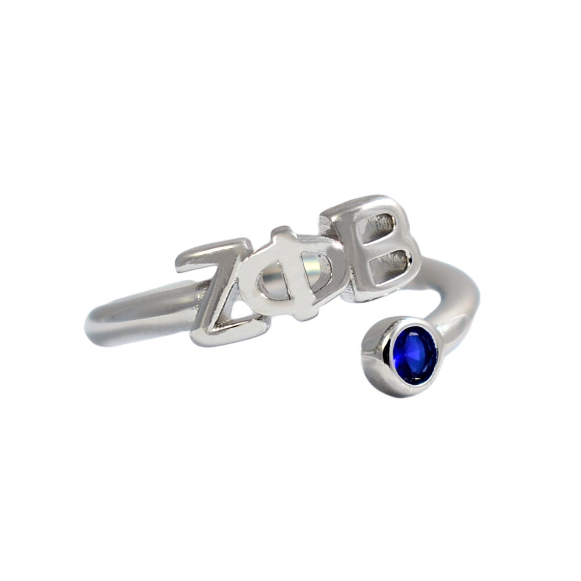 - SORORITY GREEK LETTER RING - Sorority pride is in the air! Show off your Zeta Phi Beta sisterhood with this personalized wraparound ring. Proudly showing your Greek letters, plated in white-gold and including a beautiful colored gemstone, they're perfect for continued wear at home or on campus.